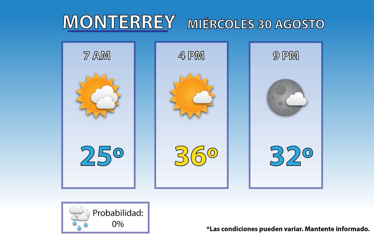 Información, fotos y videos en milenio. Temperatura y velocidad del viento en monterrey. Clima en monterrey con el estado del tiempo a 14 días. Conoce la temperatura actual y el pronostico del clima para monterrey en los próximos 5 días. Cielo parcialmente nublado durante el día, por la tarde se incrementa la nubosidad y se pronostican lluvias puntuales muy fuertes en san luis potosí.